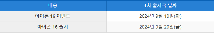 | 아이폰 16 사전예약 | 2024년 9월 13일(금) 00시 |