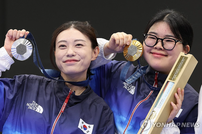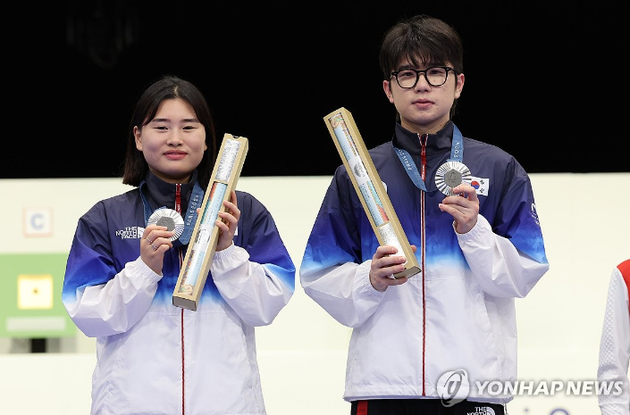 은메달 : 사격 공기소총 10m 혼성 단체 결선 "금지현(왼쪽)"과 "박하준"