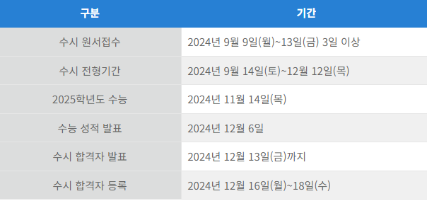 수시원서 접수기간은 2024년 9월 9일(월) ~ 9월 13일(금) 중 각 대학은 이 기간 중 3일 이상 원서접수를 시행하게 됩니다.